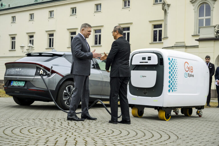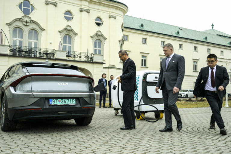 Zľava: Predseda vlády SR Robert Fico a predseda predstavenstva spoločnosti Gotion InoBat Batteries a prezident Gotion EMEA Steven Cai počas prezentácie mobilnej nabíjacej stanice (vpravo) a nabíjania elektromobilu Kia EV6 (vľavo) v záhrade Úradu vlády SR, ktorú predseda vlády SR dostal ako dar v rámci jeho návštevy závodu Gotion v Číne. Bratislava, 26. február 2025. Foto: SITA/Milan Illík
