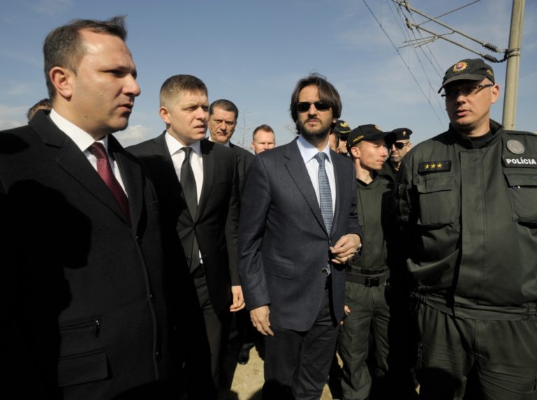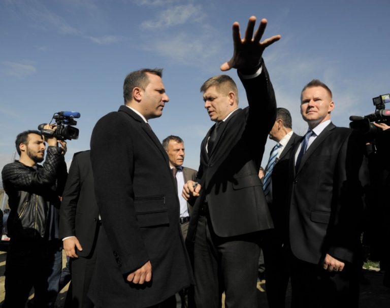 Zľava: Predseda vlády SR Robert Fico a minister vnútra SR Robert Kaliňák počas návštevy macedónsko-gréckych hraníc v Gevgeliji. Gevgelija, Macedónsko, 2. marec 2016. Foto: SITA/Martin Medňanský