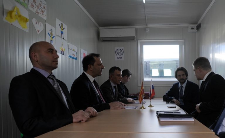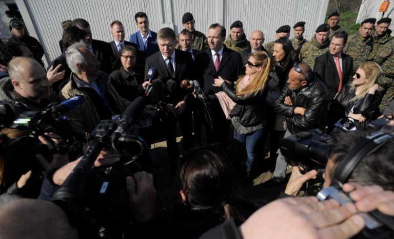 Zľavav strede: Predseda vlády SR Robert Fico a minister vnútra Macedónskej republiky Oliver Spasovski počas TB v rámci návštevy macedónsko-gréckych hraníc v Gevgeliji. Gevgelija, Macedónsko, 2. marec 2016. Foto: SITA/Martin Medňanský