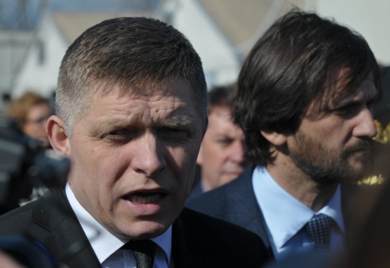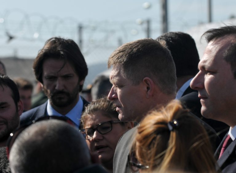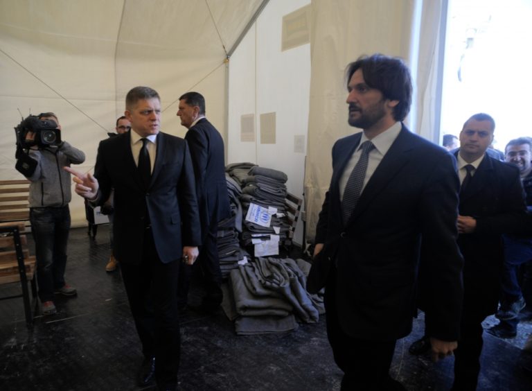 Zľava: Predseda vlády SR Robert Fico a minister vnútra SR Robert Kaliňák počas prehliadky tranzitného centra v rámci návštevy macedónsko-gréckych hraníc v Gevgeliji. Gevgelija, Macedónsko, 2. marec 2016. Foto: SITA/Martin Medňanský