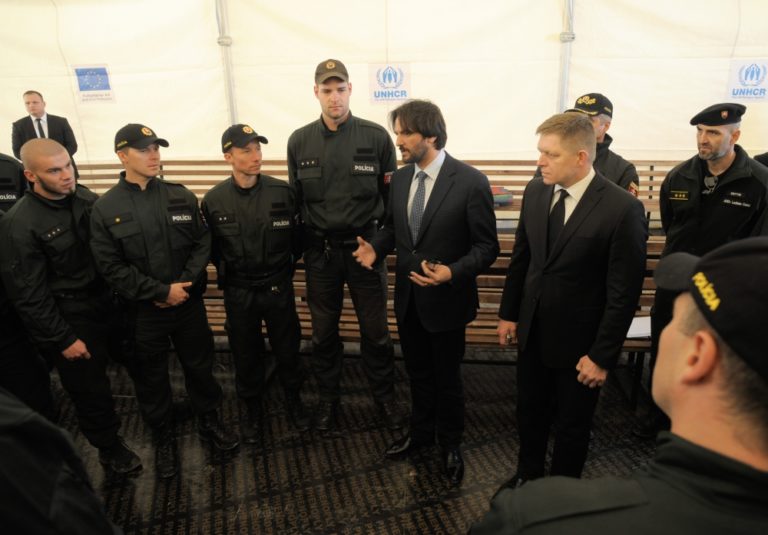 Sprava: Predseda vlády SR Robert Fico, minister vnútra SR Robert Kaliňák a príslušníci PZ SR počas prehliadky tranzitného centra v rámci návštevy macedónsko-gréckych hraníc v Gevgeliji. Gevgelija, Macedónsko, 2. marec 2016. Foto: SITA/Martin Medňanský