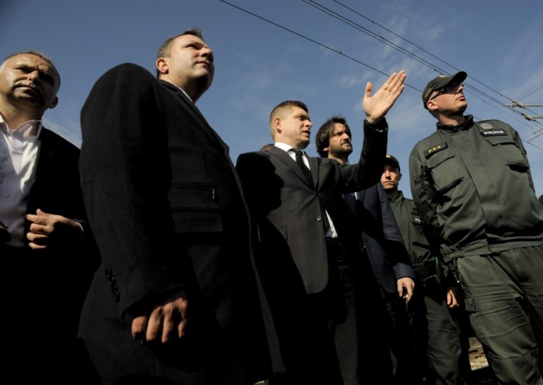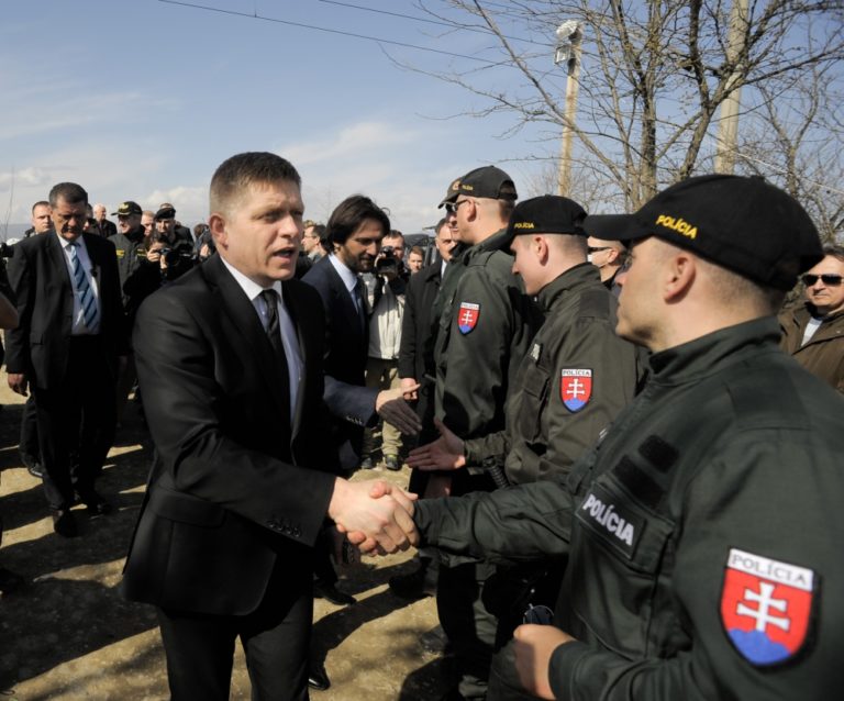 Zľava: Predseda vlády SR Robert Fico, minister vnútra SR Robert Kaliňák a príslušníci PZ SR počas návštevy macedónsko-gréckych hraníc v Gevgeliji. Gevgelija, Macedónsko, 2. marec 2016. Foto: SITA/Martin Medňanský