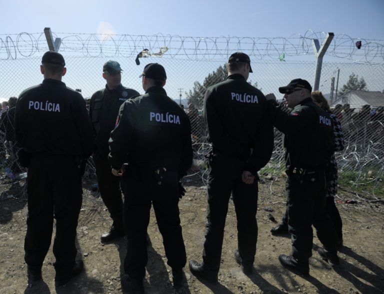 Príslušníci Policajného zboru SR na macedónsko-gréckych hraniciach v Gevgeliji. Gevgelija, Macedónsko, 2. marec 2016. Foto: SITA/Martin Medňanský
