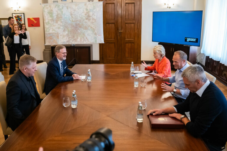 Zľava za stolom: Premiér Slovenskej republiky Robert Fico, predseda vlády Českej republiky Peter Fiala, predsedníčka Európskej komisie Ursula von der Leyen, premiér Poľska Donald Tusk a spolkový kancelár Rakúskej republiky Karl Nehammer počas rokovania predsedníčky Európskej komisie a premiérov krajín zasiahnutých povodňami vo Vroclave v Poľsku o prijatých opatreniach a možnostiach riešenia následkov ničivých povodní, ktoré v uplynulých dňoch postihli krajiny strednej Európy. Vroclav, Poľsko, 19. september 2024. Foto: SITA/Úrad vlády SR