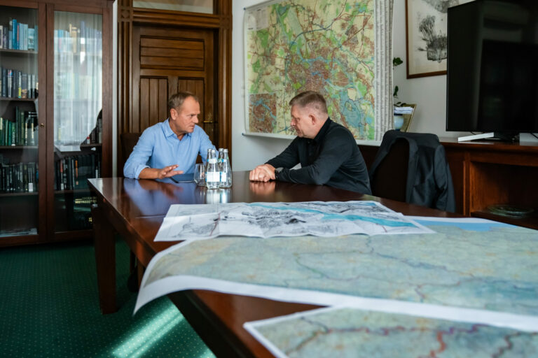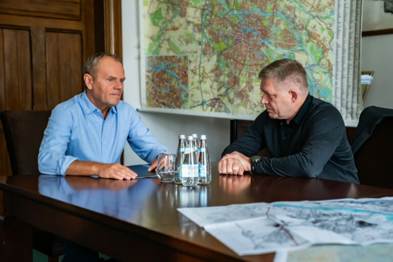 Sprava: Premiér Slovenskej republiky Robert Fico a premiér Poľska Donald Tusk pred rokovaním predsedníčky Európskej komisie a premiérov krajín zasiahnutých povodňami vo Vroclave v Poľsku o prijatých opatreniach a možnostiach riešenia následkov ničivých povodní, ktoré v uplynulých dňoch postihli krajiny strednej Európy. Vroclav, Poľsko, 19. september 2024. Foto: SITA/Úrad vlády SR