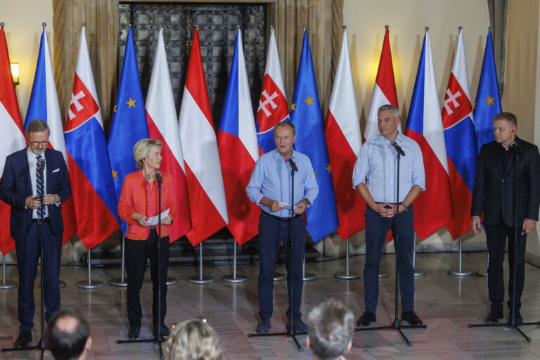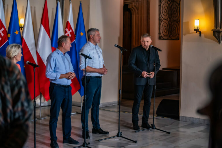 Zľava: Predseda vlády Českej republiky Peter Fiala, predsedníčka Európskej komisie Ursula von der Leyen, premiér Poľska Donald Tusk, kancelár Rakúskej republiky Karl Nehammer a premiér Slovenskej republiky Robert Fico počas tlačovej konferencie po rokovaní predsedníčky Európskej komisie a premiérov krajín zasiahnutých povodňami vo Vroclave v Poľsku o prijatých opatreniach a možnostiach riešenia následkov ničivých povodní, ktoré v uplynulých dňoch postihli krajiny strednej Európy. Vroclav, Poľsko, 19. september 2024. Foto: SITA/Úrad vlády SR