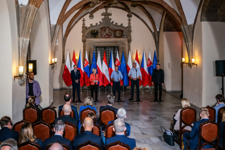 V pozadí zľava: Predseda vlády Českej republiky Peter Fiala, predsedníčka Európskej komisie Ursula von der Leyen, premiér Poľska Donald Tusk, kancelár Rakúskej republiky Karl Nehammer a premiér Slovenskej republiky Robert Fico počas tlačovej konferencie po rokovaní predsedníčky Európskej komisie a premiérov krajín zasiahnutých povodňami vo Vroclave v Poľsku o prijatých opatreniach a možnostiach riešenia následkov ničivých povodní, ktoré v uplynulých dňoch postihli krajiny strednej Európy. Vroclav, Poľsko, 19. september 2024. Foto: SITA/Úrad vlády SR