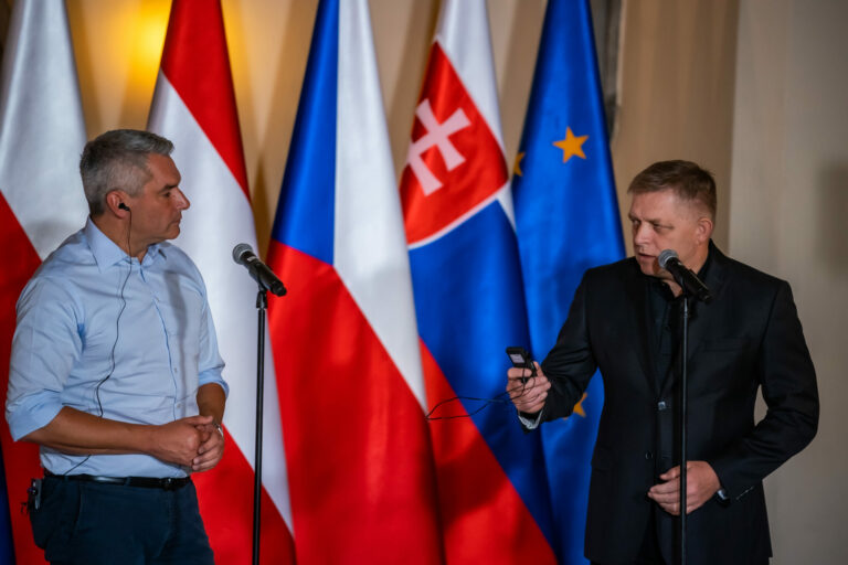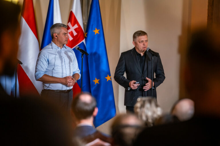 Zľava: Kancelár Rakúskej republiky Karl Nehammer a premiér Slovenskej republiky Robert Fico počas tlačovej konferencie po rokovaní predsedníčky Európskej komisie a premiérov krajín zasiahnutých povodňami vo Vroclave v Poľsku o prijatých opatreniach a možnostiach riešenia následkov ničivých povodní, ktoré v uplynulých dňoch postihli krajiny strednej Európy. Vroclav, Poľsko, 19. september 2024. Foto: SITA/Úrad vlády SR