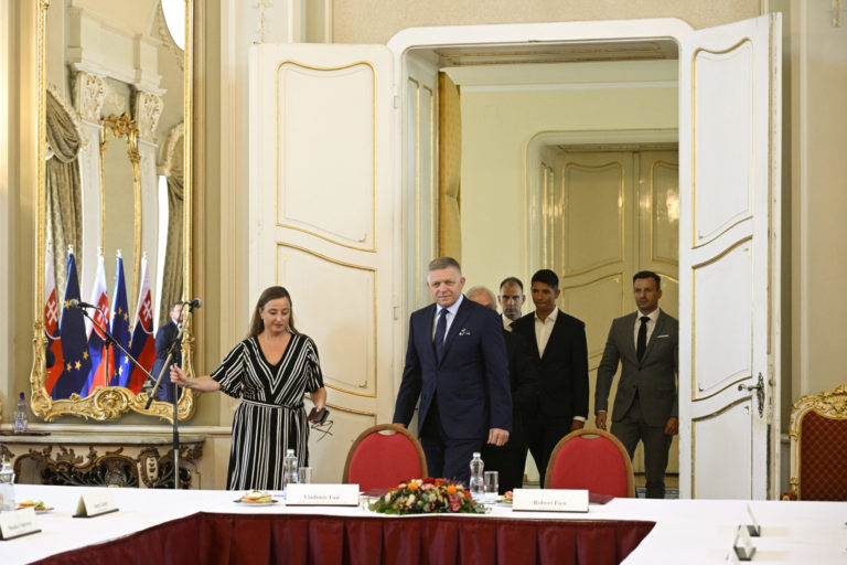 Predseda vlády SR Robert Fico (druhý zľava) počas príchodu v rámci slávnostného podpisu Deklarácie k rozvoju spoločenského dialógu v SR, ktorá vychádza z doterajších skúseností z úspešnej celospoločenskej spolupráce v Rade solidarity a rozvoja v nadväznosti na Európsky sociálny dialóg a jeho realizácie v podmienkach slovenskej spoločnosti, v Zrkadlovej sále historickej budovy Úradu vlády SR. Bratislava, 22. august 2024. Foto: SITA/Milan Illík