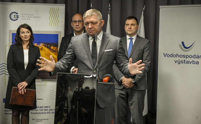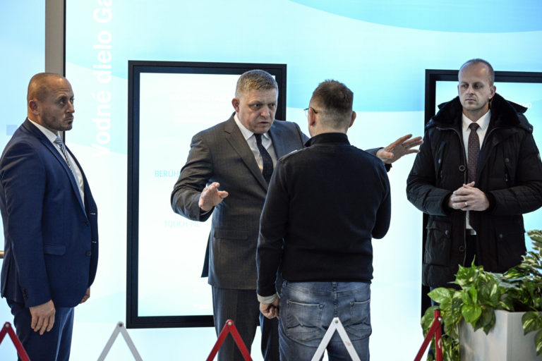 Predseda vlády Robert Fico (uprostred vľavo) počas návštevy Vodného diela (VD) Gabčíkovo a tlačového brífingu a na tému: Inovácia a modernizácia plavebných komôr pre zvýšenie bezpečnosti a intenzity vodnej dopravy na VD Gabčíkovo - odovzdanie ľavej plavebnej komory do užívania. Gabčíkovo, 30. november 2023. Foto: SITA/Milan Illík