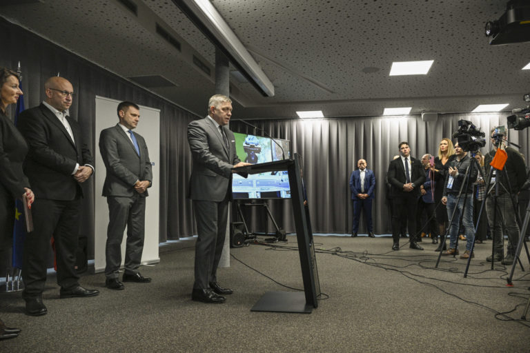 Zľava: Poverená generálna riaditeľka štátneho podniku Vodohospodárska výstavba Jana Ježíková, minister dopravy Jozef Ráž, minister životného prostredia Tomáš Taraba a predseda vlády Robert Fico počas návštevy Vodného diela (VD) Gabčíkovo a tlačového brífingu a na tému: Inovácia a modernizácia plavebných komôr pre zvýšenie bezpečnosti a intenzity vodnej dopravy na VD Gabčíkovo - odovzdanie ľavej plavebnej komory do užívania. Gabčíkovo, 30. november 2023. Foto: SITA/Milan Illík