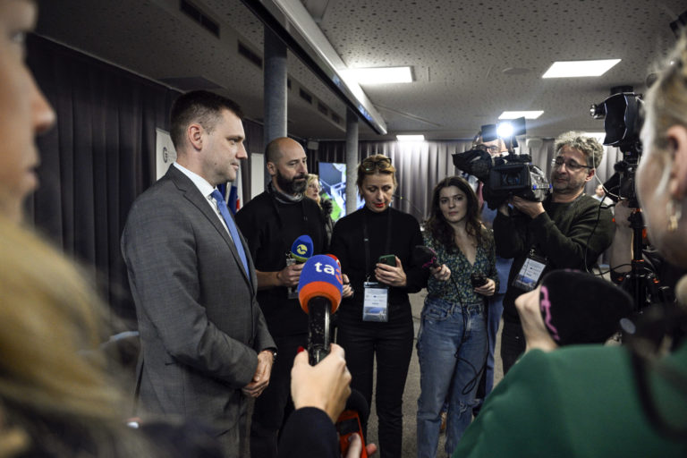 Minister životného prostredia Tomáš Taraba (vľavo) počas návštevy Vodného diela (VD) Gabčíkovo a tlačového brífingu na tému: Inovácia a modernizácia plavebných komôr pre zvýšenie bezpečnosti a intenzity vodnej dopravy na VD Gabčíkovo - odovzdanie ľavej plavebnej komory do užívania. Gabčíkovo, 30. november 2023. Foto: SITA/Milan Illík