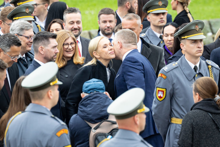 Sprava uprostred: Premiér SR Robert Fico a podpredsedníčka vlády a ministerka hospodárstva SR Denisa Saková na Slavíne pri príležitosti 79. výročia ukončenia 2. svetovej vojny a Dňa víťazstva nad fašizmom. Bratislava, 8. máj 2024. Foto: SITA/Jana Birošová