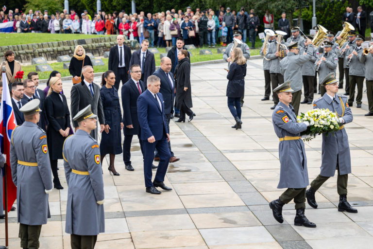 Premiér SR Robert Fico (uprostred) na Slavíne pri príležitosti 79. výročia ukončenia 2. svetovej vojny a Dňa víťazstva nad fašizmom. Bratislava, 8. máj 2024. Foto: SITA/Jana Birošová