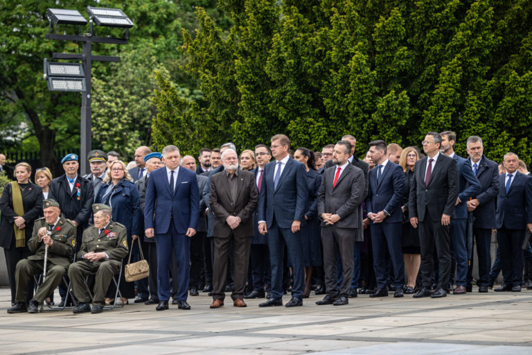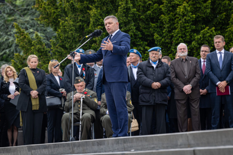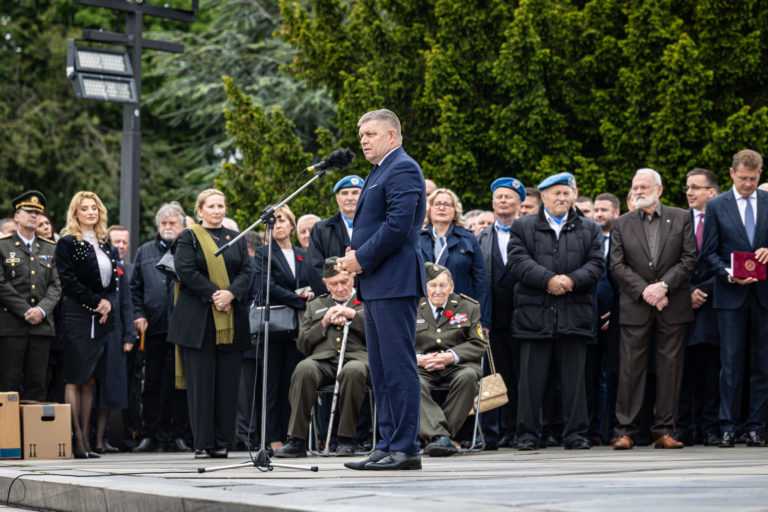 Premiér SR Robert Fico (uprostred) počas príhovoru na Slavíne pri príležitosti 79. výročia ukončenia 2. svetovej vojny a Dňa víťazstva nad fašizmom. Bratislava, 8. máj 2024. Foto: SITA/Jana Birošová