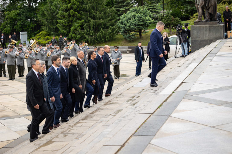 Premiér SR Robert Fico (piaty zľava) a poslanci NR SR na Slavíne pri príležitosti 79. výročia ukončenia 2. svetovej vojny a Dňa víťazstva nad fašizmom. Bratislava, 8. máj 2024. Foto: SITA/Jana Birošová