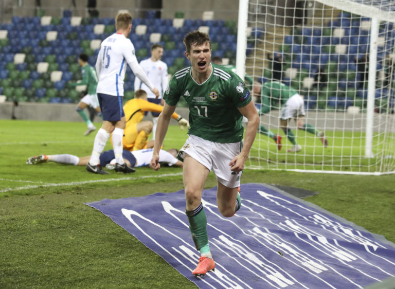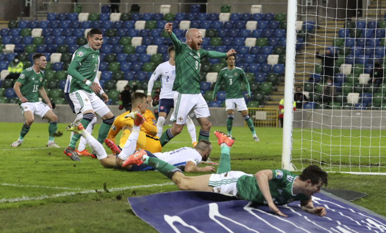 Paddy McNair zo Severného Írska oslavuje gól svojho tímu vo finále baráže o postup na odložené majstrovstvá Európy 2020 medzi Severným Írskom a Slovensko. Foto: SITA/AP