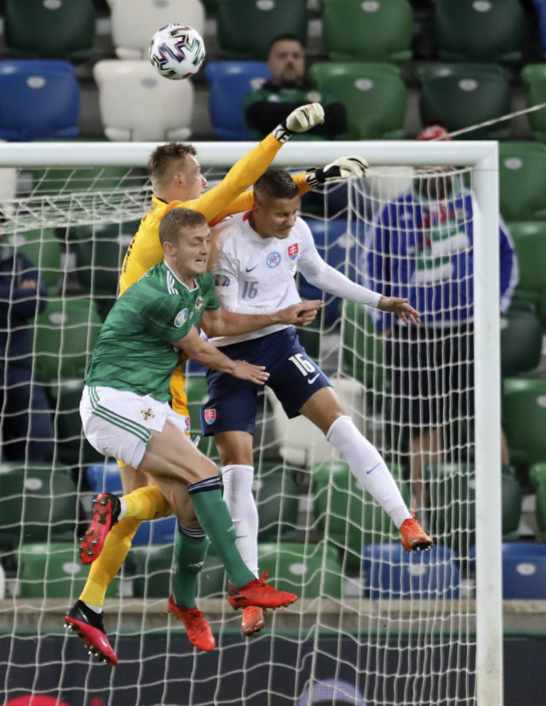 Slovenský brankár Marek Rodák zneškodňuje príležitosť súpera vo finále baráže o postup na odložené majstrovstvá Európy 2020 medzi Severným Írskom a Slovensko. Foto: SITA/AP