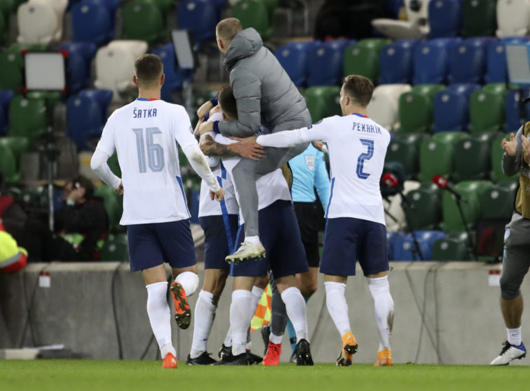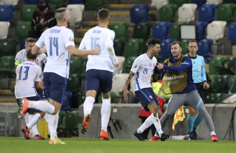 Radosť Slovákov po víťazstve vo finále baráže o postup na odložené majstrovstvá Európy 2020 medzi Severným Írskom a Slovensko. Foto: SITA/AP