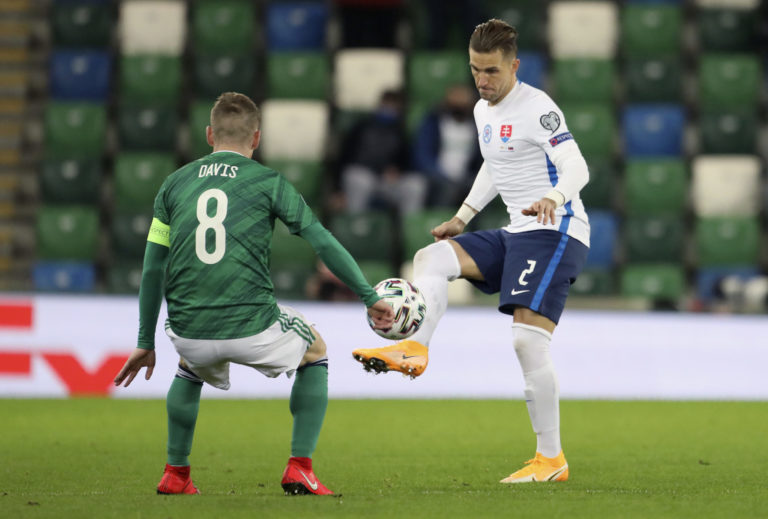 Slovák Peter Pekarik (vpravo) odkopáva loptu pred Stevenom Davisom vo finále baráže o postup na odložené majstrovstvá Európy 2020 medzi Severným Írskom a Slovensko. Foto: SITA/AP