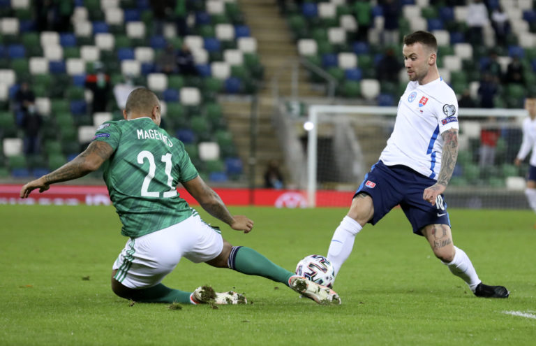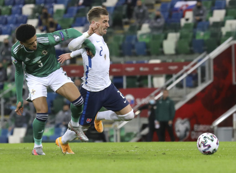 Jamal Lewis (vľavo) v súboji s Petrom Pekaríkom vo finále baráže o postup na odložené majstrovstvá Európy 2020 medzi Severným Írskom a Slovensko. Foto: SITA/AP