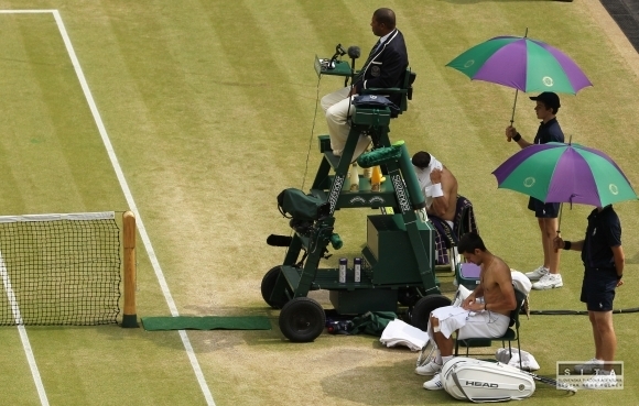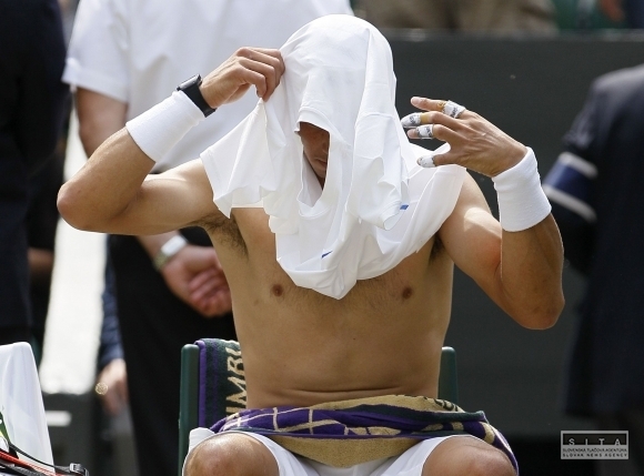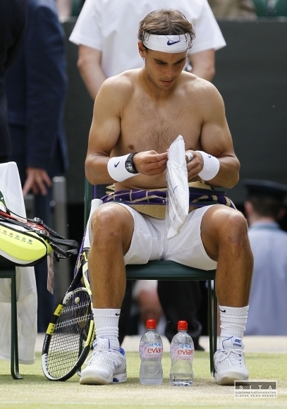 Španielsky tenista Rafael Nadal si vymieňa tričko počas finále dvojhry mužov na treťom grandslamovom turnaji tenisovej sezóny Wimbledone v Londýne (20. júna - 3. júla, celková dotácia 14,6 milióna libier, tráva) v súboji s Novakom Djokovičom zo Srbska. Foto: SITA/AP