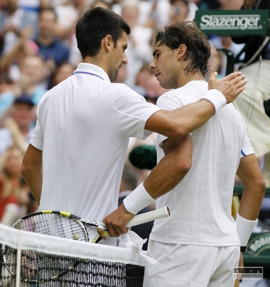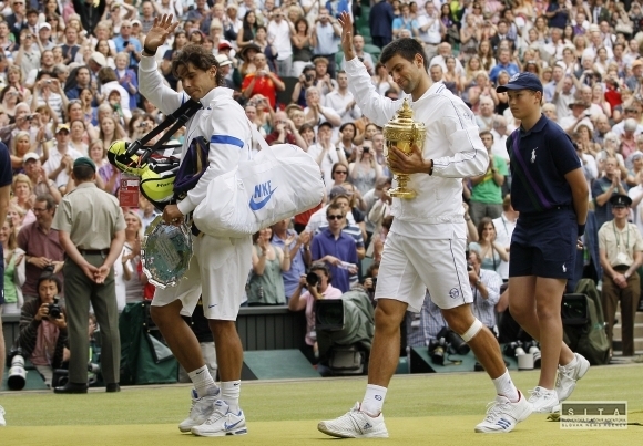 Srbský tenista Novak Djokovič a Rafael Nadal zo Španielska pred finále dvojhry mužov na treťom grandslamovom turnaji tenisovej sezóny Wimbledone v Londýne (20. júna - 3. júla, celková dotácia 14,6 milióna libier, tráva). Foto: SITA/AP