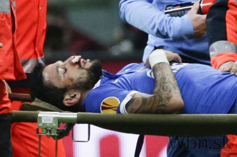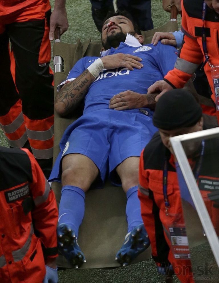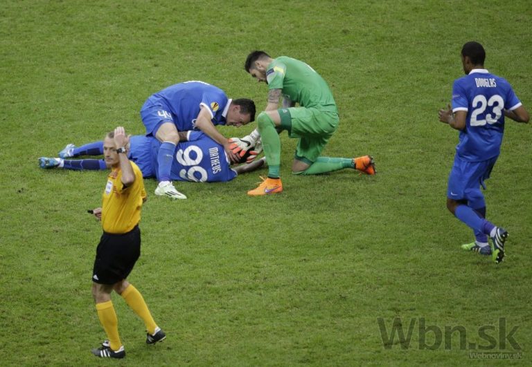 Futbalisti Dnipra Dnipropetrovsk pomáhajú otrasenému spoluhráčovi Matheusovi počas finálového zápasu Európskej ligy. Varšava, 27. máj 2015. Foto: SITA/AP