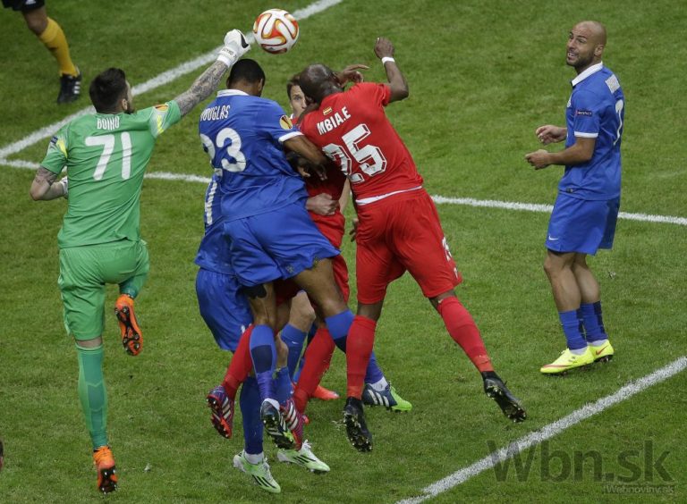 Hlavičkový súboj hráčov Dnipra Dnipropetrovsk a FC Sevilla pred brankárom Denisom Bojkom počas finálového zápasu Európskej ligy. Varšava, 27. máj 2015. Foto: SITA/AP