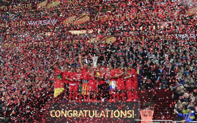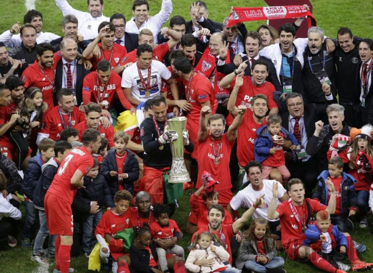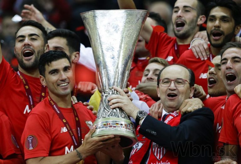 Hráči FC Sevilla a prezident klubu s víťaznou trofejou po finálovom zápase Európskej ligy, v ktorom zdolali Dnipro Dnipropetrovsk 3:2. Varšava, 27. máj 2015. Foto: SITA/AP