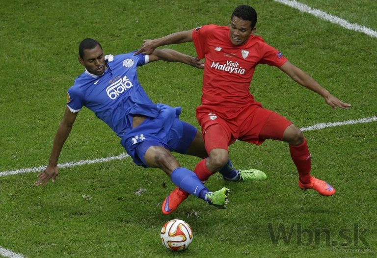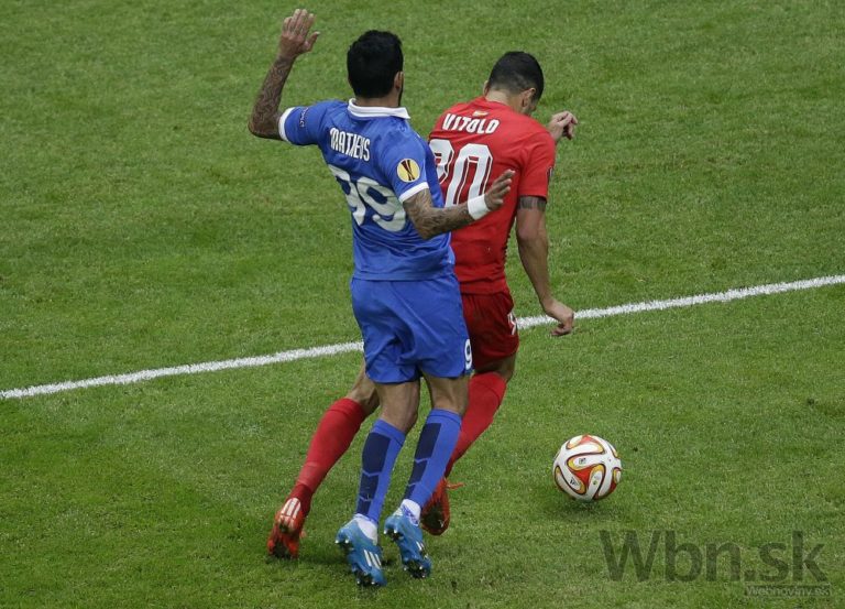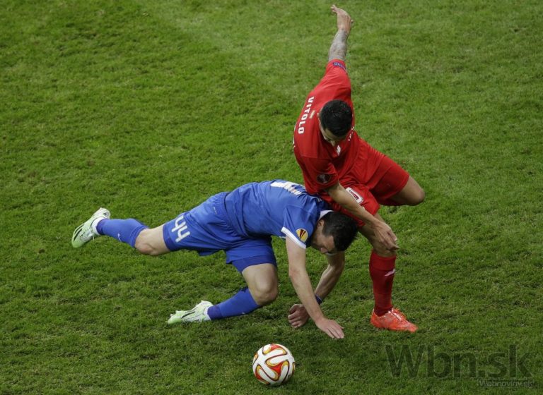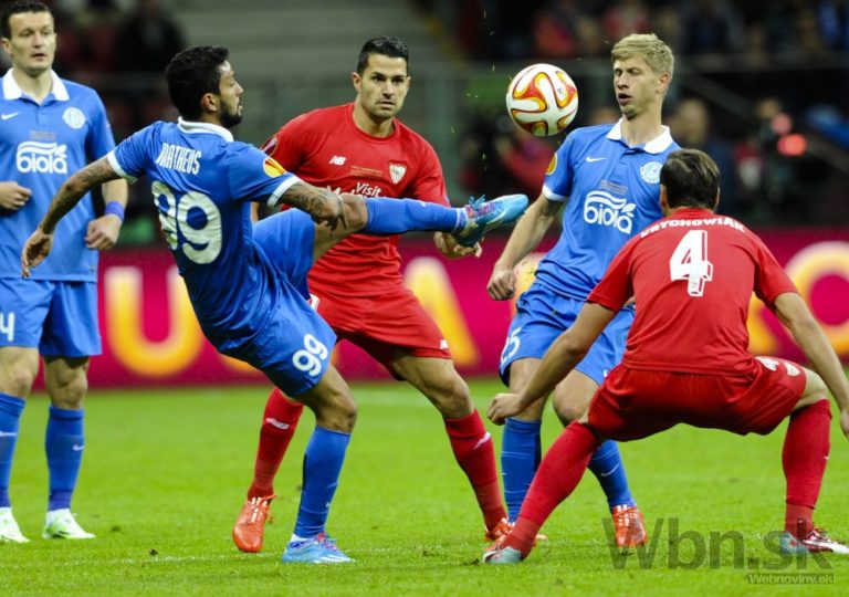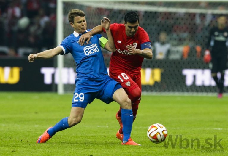 Súboj hráčov Dnipra Dnipropetrovsk a FC Sevilla počas finálového zápasu Európskej ligy. Varšava, 27. máj 2015. Foto: SITA/AP