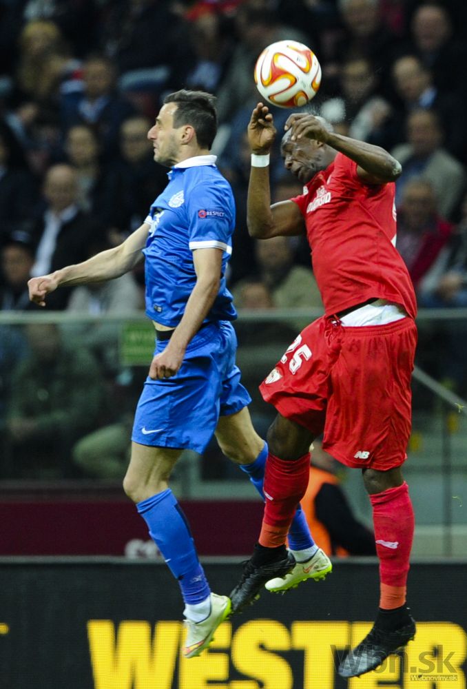 Hráč FC Sevilla Stephane Mbia v hlavičkom súboji s útočníkom Dnipra Dnipropetrovsk Nikolom Kaliničom počas finálového zápasu Európskej ligy. Varšava, 27. máj 2015. Foto: SITA/AP