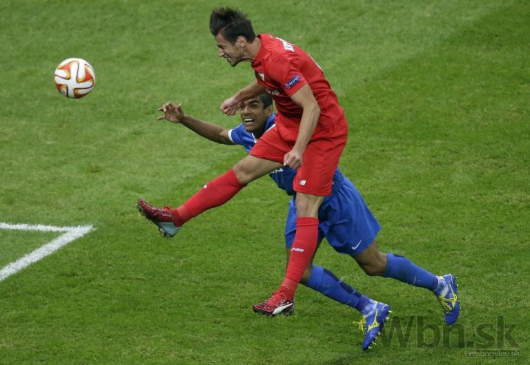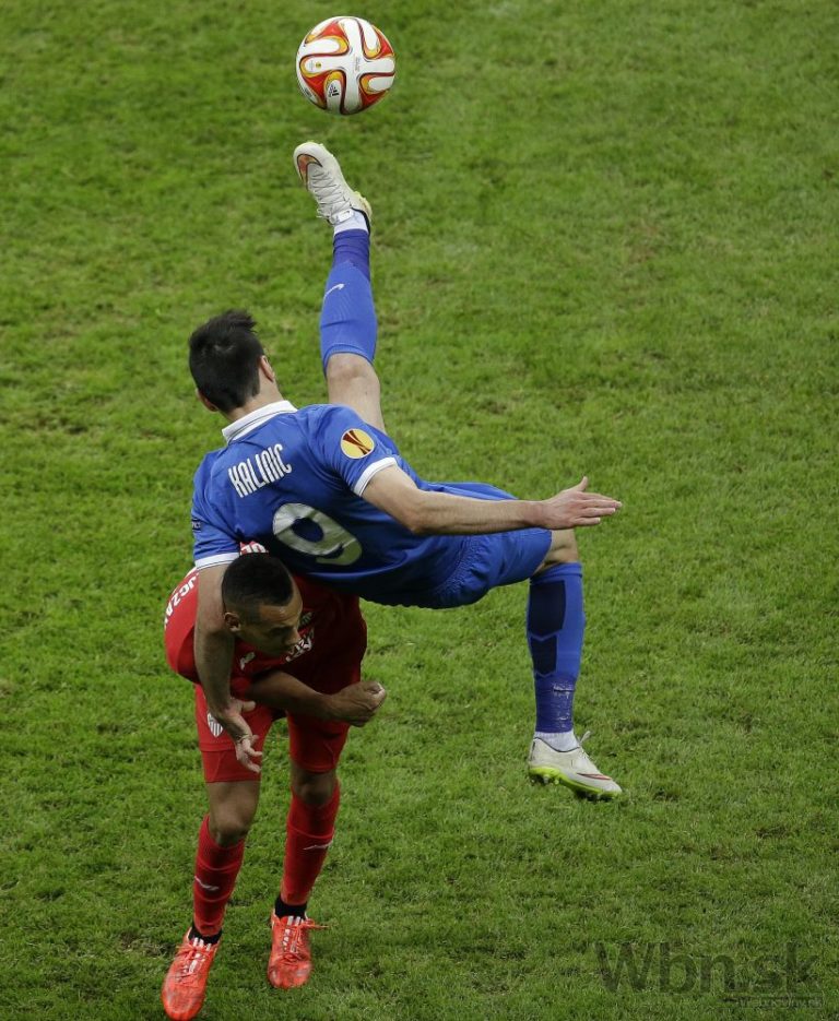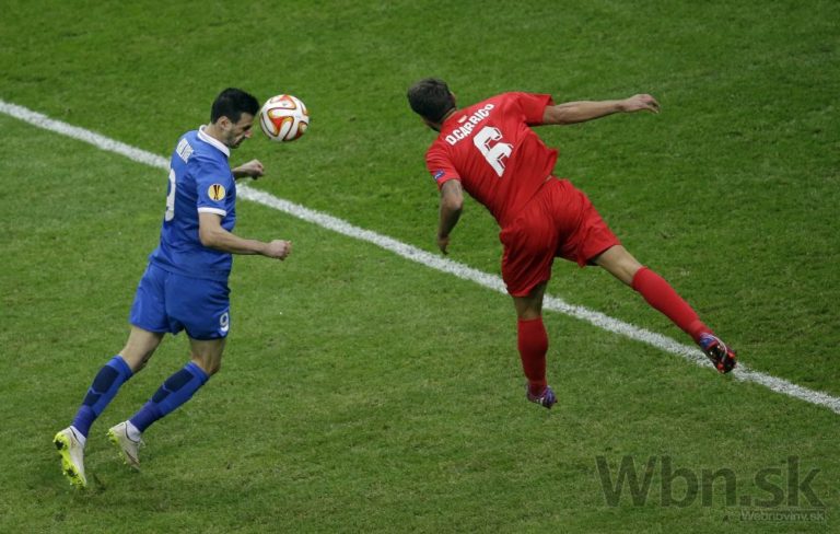 Hráč Dnipra Dnipropetrovsk Nikola Kalinič v hlavičkovom súboji s Danielom Carricom z FC Sevilla počas finálového zápasu Európskej ligy. Varšava, 27. máj 2015. Foto: SITA/AP