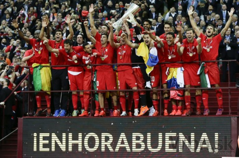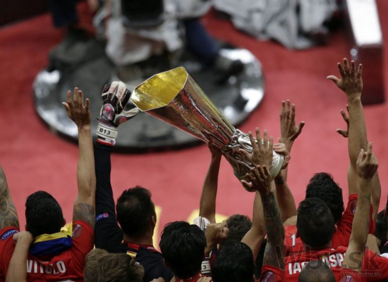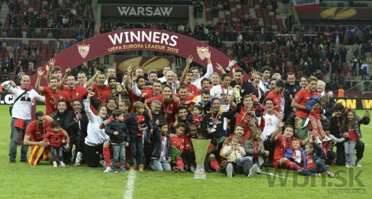 Hráči FC Sevilla s víťaznou trofejou po finálovom zápase Európskej ligy, v ktorom zdolali Dnipro Dnipropetrovsk 3:2. Varšava, 27. máj 2015. Foto: SITA/AP