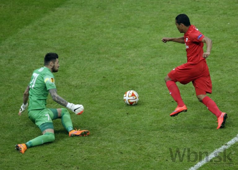 Útočník FC Sevilla Carlos Bacca prekonáva brankára Dnipra Dnipropetrovsk Denisa Bojka počas finálového zápasu Európskej ligy. Varšava, 27. máj 2015. Foto: SITA/AP