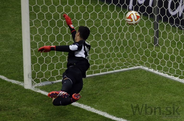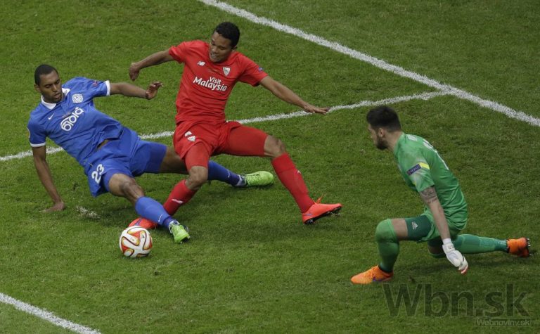Lopta po strele Ruslana Rotaňa z Dnipra Dnipropetrovsk končí v sieti brankára FC Sevilla Sergia Rica počas finálového zápasu Európskej ligy. Varšava, 27. máj 2015. Foto: SITA/AP