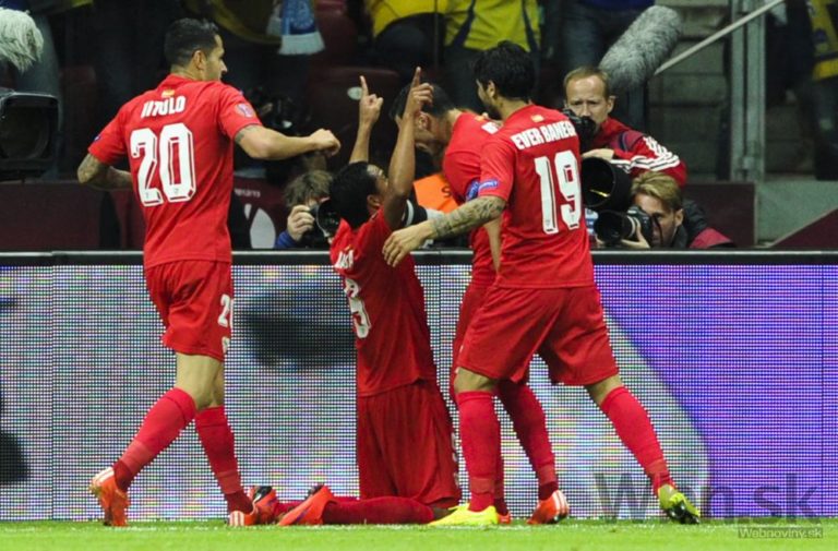 Hráči FC Sevilla sa tešia z gólu v sieti Dnipra Dnipropetrovsk počas finálového zápasu Európskej ligy. Varšava, 27. máj 2015. Foto: SITA/AP