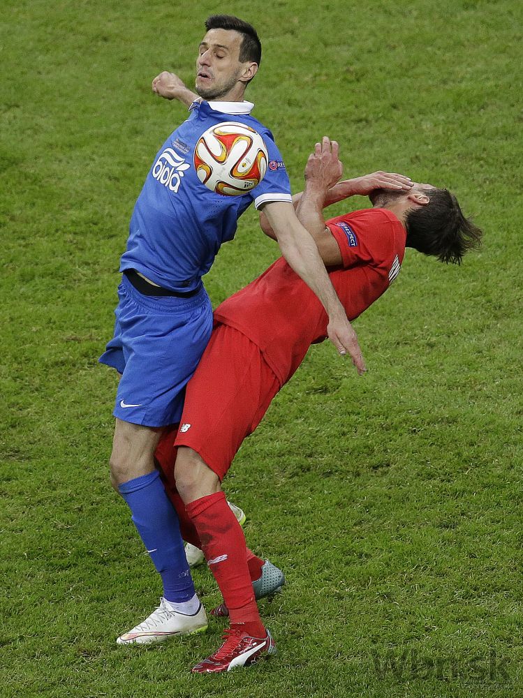 Hráč FC Sevilla Timothee Kolodziejczak v súboji s útočníkom Dnipra Dnipropetrovsk Nikolom Kaliničom počas finálového zápasu Európskej ligy. Varšava, 27. máj 2015. Foto: SITA/AP