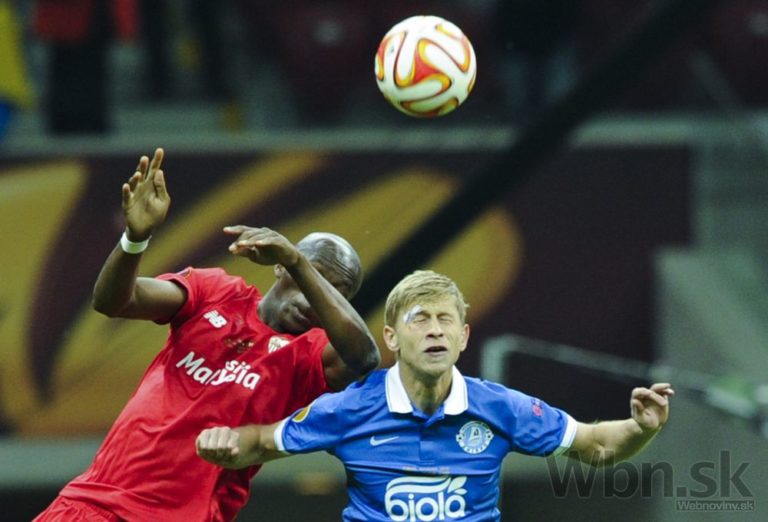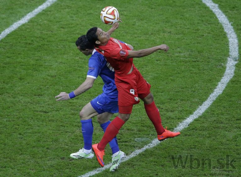 Útočník FC Sevilla Carlos Bacca v hlavičkom súboji s Artemom Fedeckým z Dnipra Dnipropetrovsk počas finálového zápasu Európskej ligy. Varšava, 27. máj 2015. Foto: SITA/AP