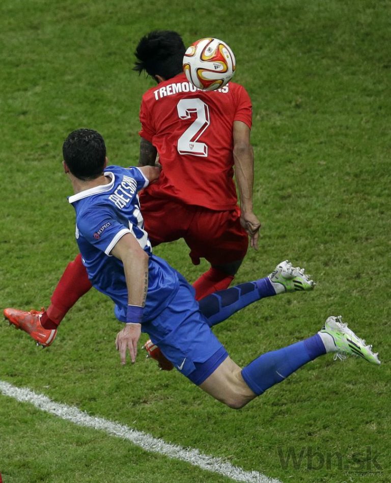 Hráč FC Sevilla Benoit Tremoulinas v súboji s Artemom Fedeckým z Dnipra Dnipropetrovsk počas finálového zápasu Európskej ligy. Varšava, 27. máj 2015. Foto: SITA/AP