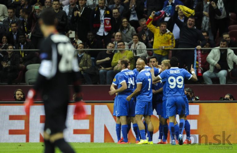 Futbalisti Dnipra Dnipropetrovsk sa tešia z gólu v sieti FC Sevilla počas finálového zápasu Európskej ligy. Varšava, 27. máj 2015. Foto: SITA/AP