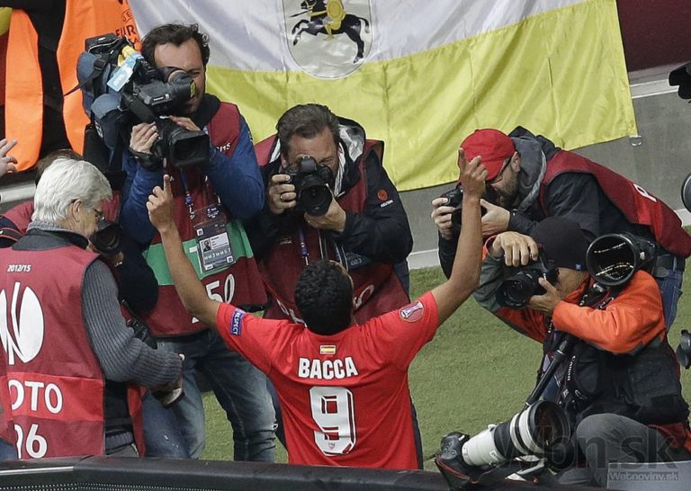 Útočník FC Sevilla Carlos Bacca sa teší z gólu, ktorý strelil Dnipru Dnipropetrovsk počas finálového zápasu Európskej ligy. Varšava, 27. máj 2015. Foto: SITA/AP