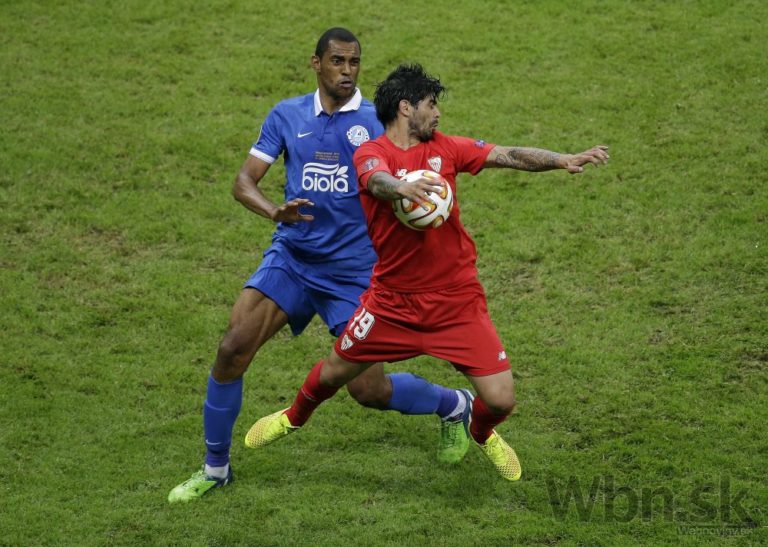 Hráč FC Sevilla Vitolo v súboji s Matheusomz Dnipra Dnipropetrovsk počas finálového zápasu Európskej ligy. Varšava, 27. máj 2015. Foto: SITA/AP