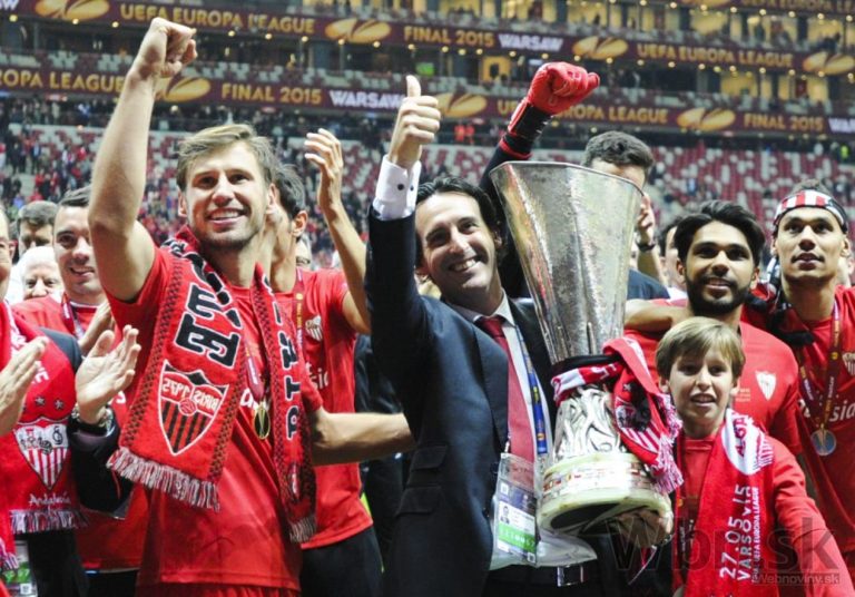 Hráči FC Sevilla a tréner Unai Emery s víťaznou trofejou po finálovom zápase Európskej ligy, v ktorom zdolali Dnipro Dnipropetrovsk 3:2. Varšava, 27. máj 2015. Foto: SITA/AP