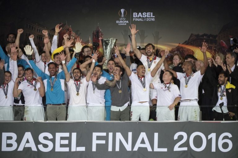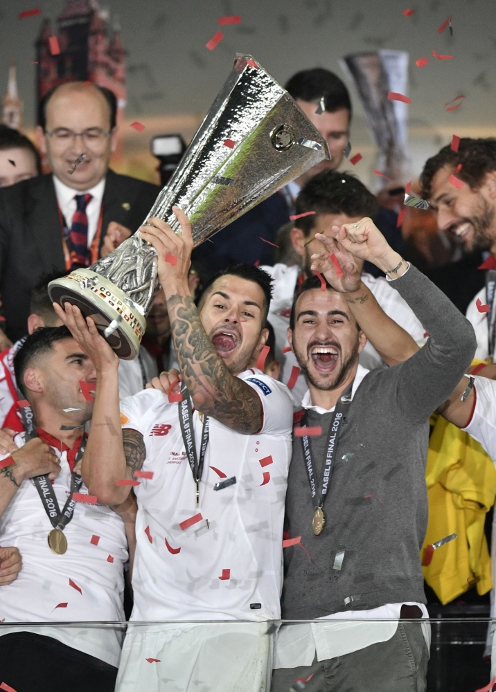 Radosť hráčov FC Sevilla s víťaznou trofejou po finálovom zápase Európskej ligy, v ktorom na Štadióne sv. Jakuba v Bazileji zdolali FC Liverpool 3:1. Bazilej, 18. máj 2016. Foto: Laurent Gillieron/Keystone via AP