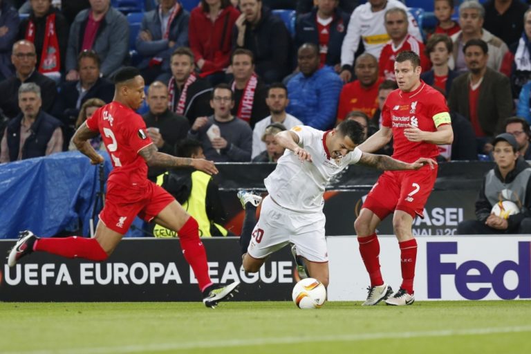 Vitolo z FC Sevilla s v súboji s hráčmi FC Liverpool Nathanielom Clyneom a Jamesom Milnerom počas finálového zápasu Európskej ligy na Štadióne sv. Jakuba v Bazileji. Bazilej, 18. máj 2016. Foto: Peter Klaunzer/Keystone via AP