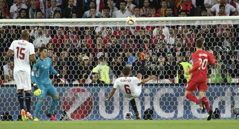 Daniel Carrico odkopáva loptu spred bránky FC Sevilla počas finálového zápasu Európskej ligy na Štadióne sv. Jakuba v Bazileji. Bazilej, 18. máj 2016. Foto: SITA/AP