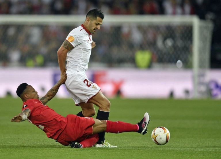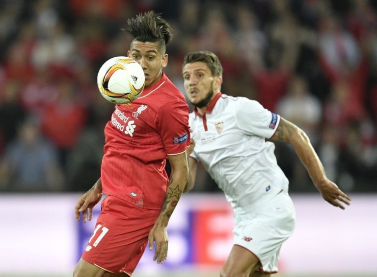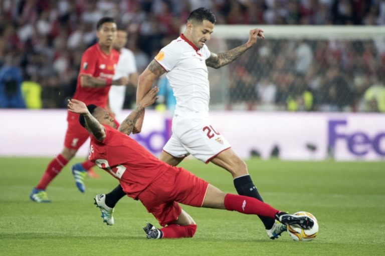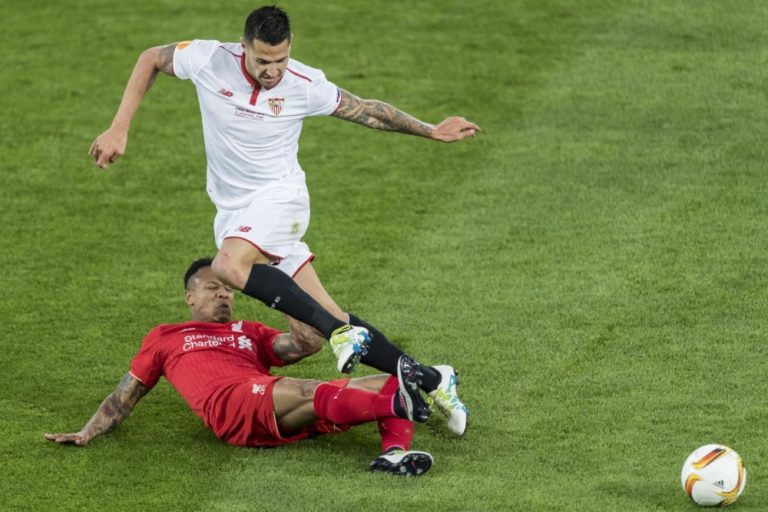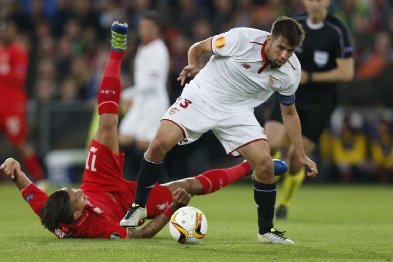 Coke z FC Sevilla v súboji s Robertom Firminom z FC Liverpool počas finálového zápasu Európskej ligy na Štadióne sv Jakuba v Bazileji. Bazilej, 18. máj 2016. Foto: Peter Klaunzer/Keystone via AP