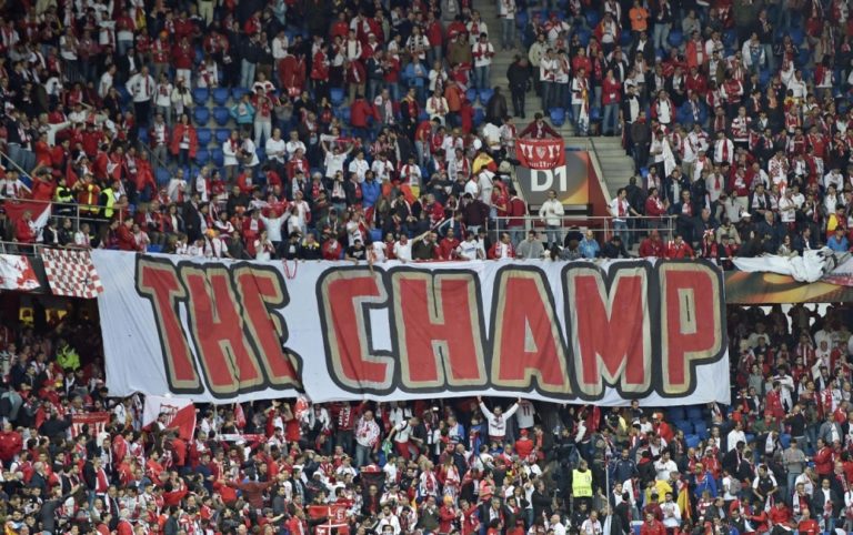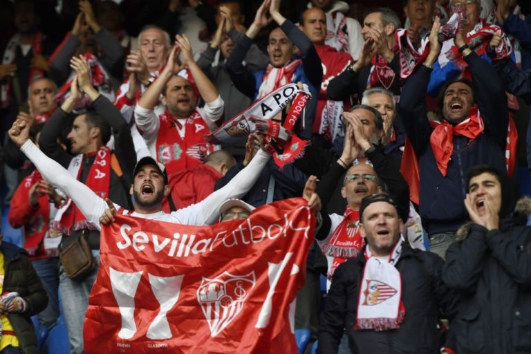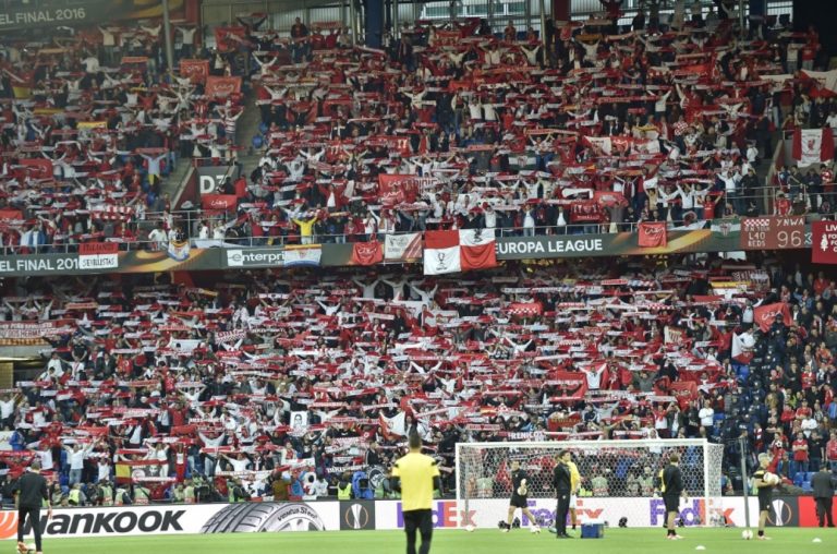 Fanúšikovia FC Sevilla počas finálového zápasu Európskej ligy na Štadióne sv. Jakuba v Bazileji. Bazilej, 18. máj 2016. Foto: Jean-Christophe Bott/Keystone via AP