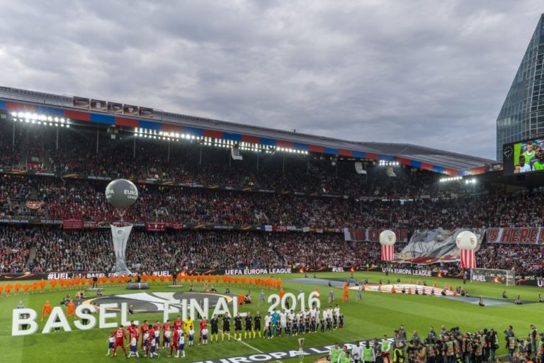 Slávnostný úvod finálového zápasu Európskej ligy medzi FC Liverpool a FC Sevilla na Štadióne sv Jakuba v Bazileji. Bazilej, 18. máj 2016. Foto: Ennio Leanza/Keystone via AP